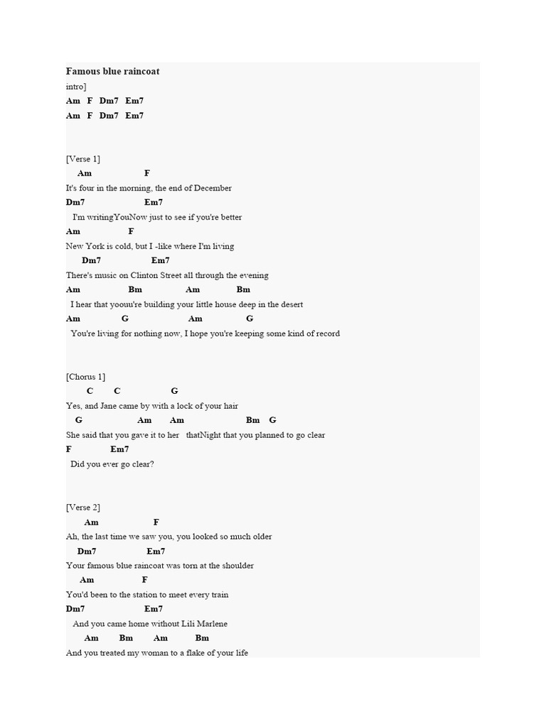 Famous Blue Raincoat English PDF Verb Singing Famous Blue Raincoat Meaning Web leonard cohen once dissected his beautiful song 'famous blue raincoat' from 'songs of love and hate', revealing he has never been satisfied with it. Web the song is a letter from a man to his rival, who stole his wife's burberry coat. Web ‘famous blue raincoat,’ a track enveloped in a shroud of melancholy, operates on a plane of. Famous Blue Raincoat Meaning.